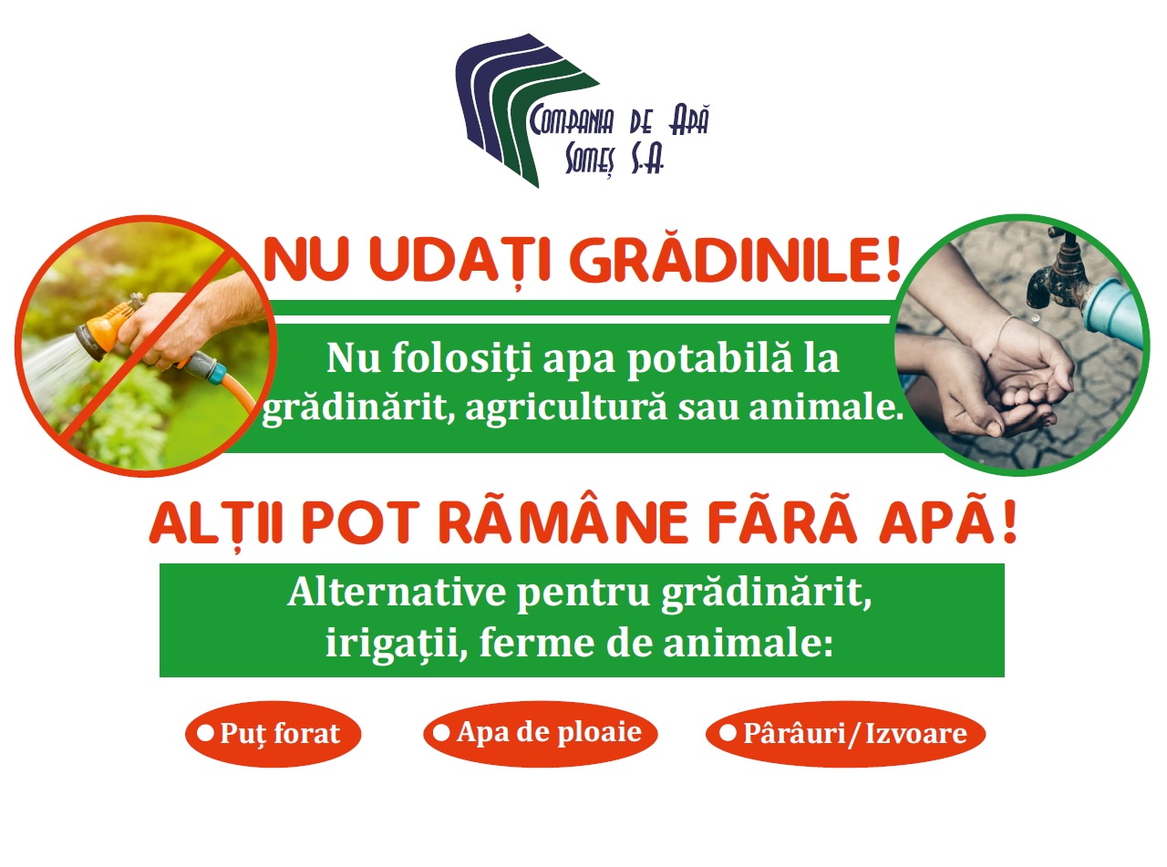 Adresăm un apel insistent consumatorilor Companiei de Apă Someș S.A., de a utiliza apa potabilă cu responsabilitate doar pentru consumul casnic, nu în alte scopuri decât cele strict gospodărești, precum irigarea grădinilor, umplerea piscinelor, spălarea autovehiculelor și de asemenea verificarea instalațiilor interioare pentru a preveni pierderile de apă.