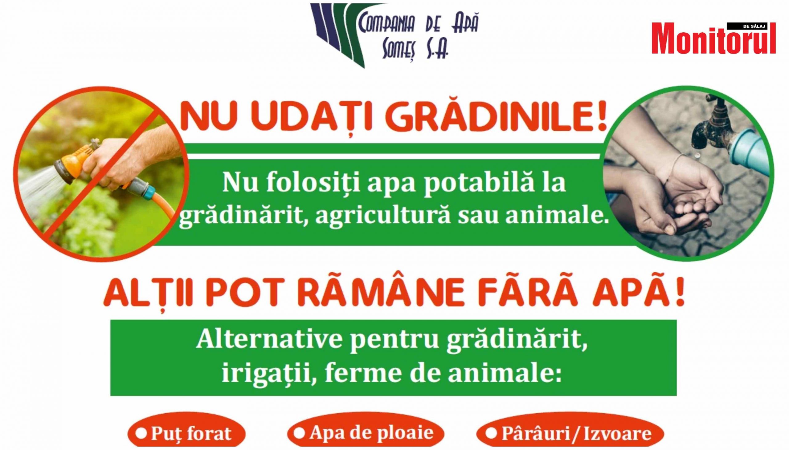Adresăm un apel insistent consumatorilor Companiei de Apă Someș S.A., de a utiliza apa potabilă cu responsabilitate doar pentru consumul casnic, nu în alte scopuri decât cele strict gospodărești, precum irigarea grădinilor, umplerea piscinelor, spălarea autovehiculelor și de asemenea verificarea instalațiilor interioare pentru a preveni pierderile de apă.