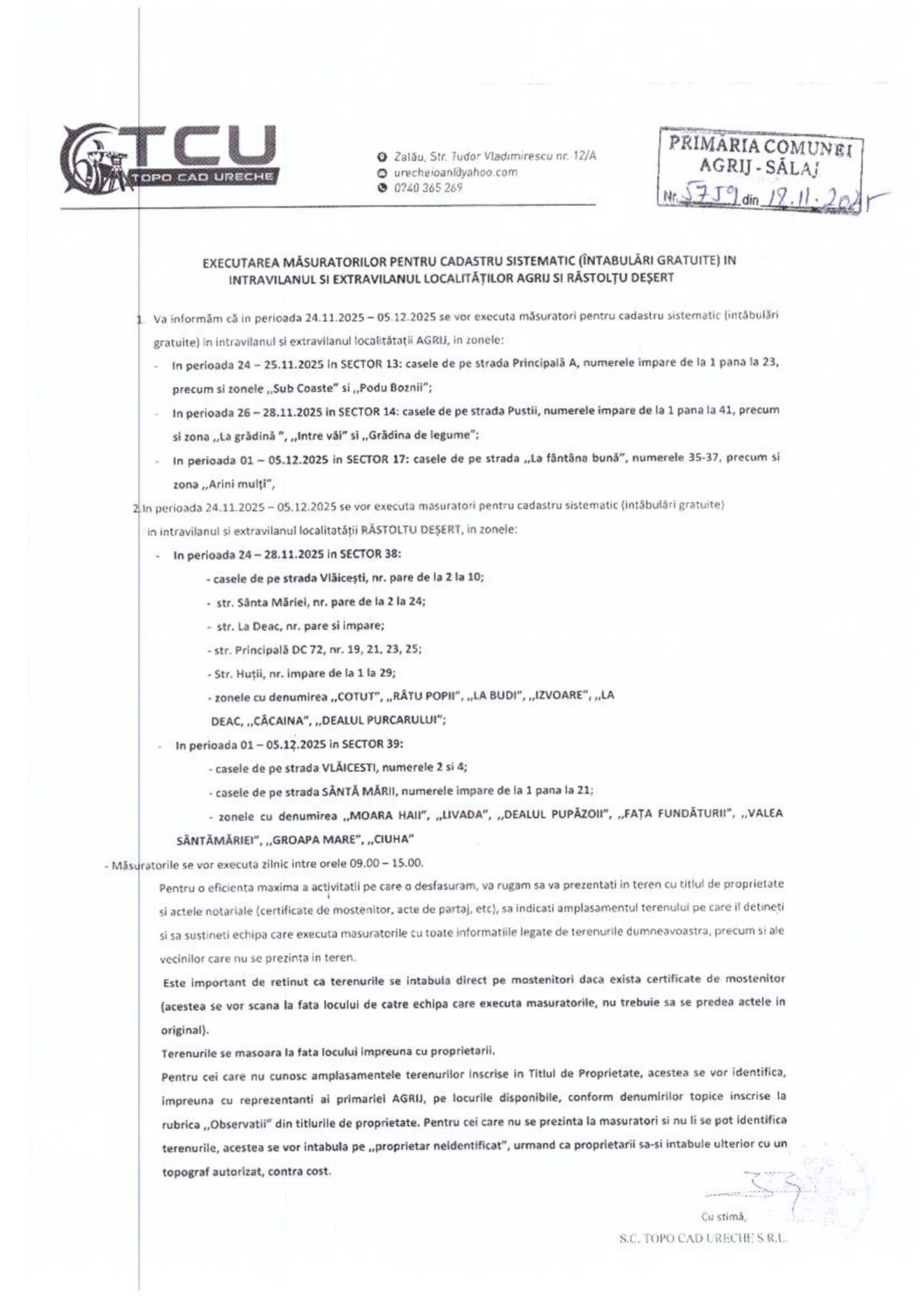 În perioada următoare, pe raza localităţilor Agrij şi Răstolţu Deşert se vor executa măsurători pentru cadastru sistemic (întabulări gratuite), atât în intravilan, cât şi în extravilan.