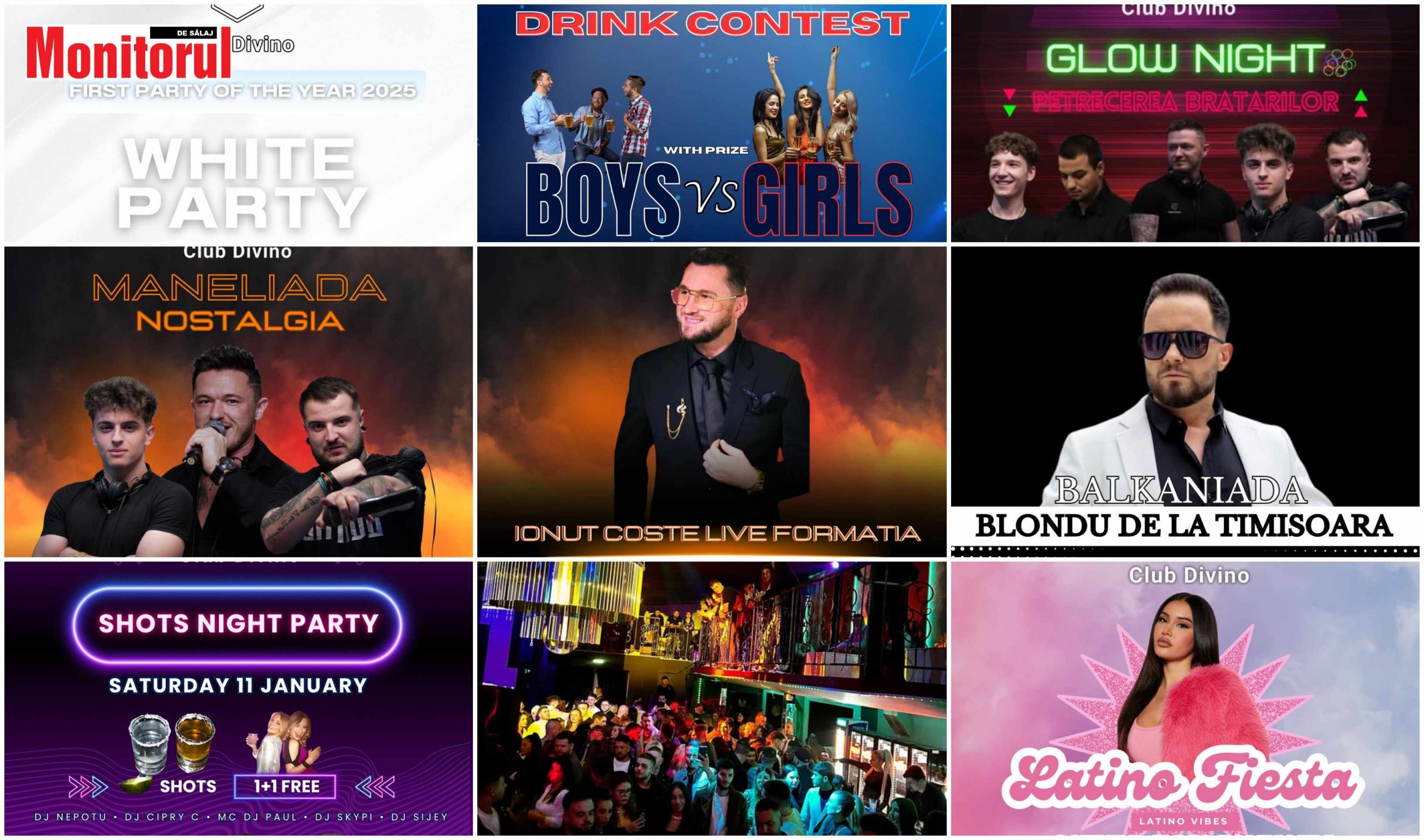 Clubul Divino din Zalău revine în forță cu o nouă serie de evenimente tematice speciale. În fiecare vineri sunt organizate petreceri cu invitați speciali din lumea muzicii de petrecere – Bogdan de la Ploiești, Culiță Sterp, Andia, Ionuț Coste cunoscutul artist zălăuan, Blondu de la Timișoara, dar și mulți alți artiști care vor urca pe scena clubului pentru a distra sălăjenii.