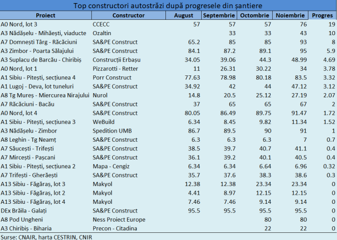 Luna noiembrie 2025 a adus unele dintre cele mai consistente progrese pe șantierele de autostrăzi din România, potrivit datelor centralizate la nivelul CNAIR și CESTRIN. Cele mai mari avansuri au fost raportate pe Autostrada Bucureștiului – A0, Autostrada Transilvania – A3 și Autostrada Moldovei – A7, iar în topul constructorilor se regăsesc companii din China, Turcia și România.